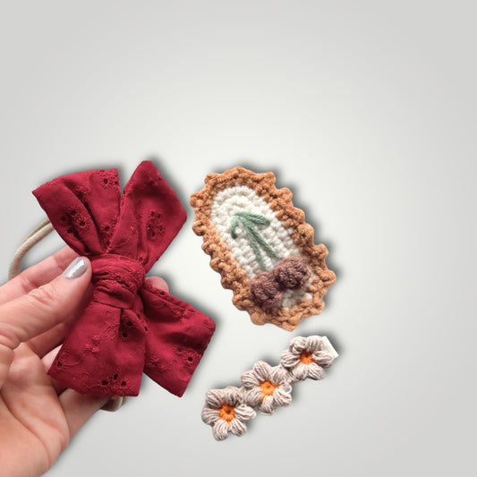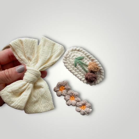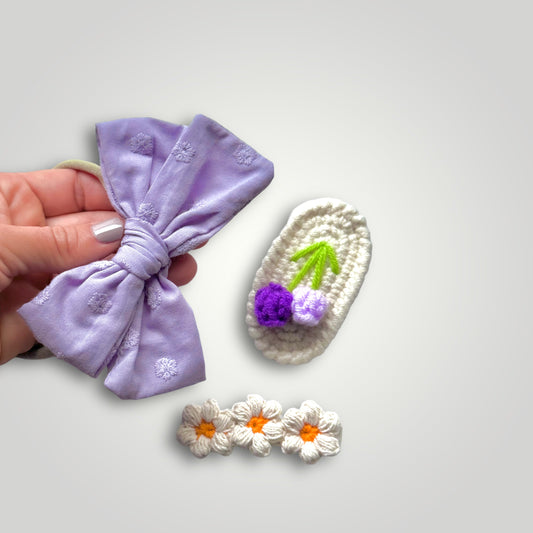Kid headband With Bow and 2 Crocheted Clips Set